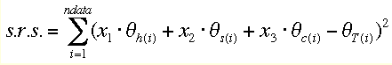 As we have three unknowns in this equation, a measurement at 3 points (different wavelengths) would suffice to solve the problem for x, the fraction of each contribution to the total measured signal. However, due to experimental error and imperfect model data the choice of points can mightily influence the result (a common source of subtle abuse in data interpretation). We usually have many more data points available from our measurement (e.g., a whole CD spectrum, sampled at 1 nm intervals from 190 to 250 nm). In this case, we can try to minimize the total deviation between all data points and calculated model values. This is done by a minimization of the sum of residuals squared (s.r.s.) which looks as follows in our case :