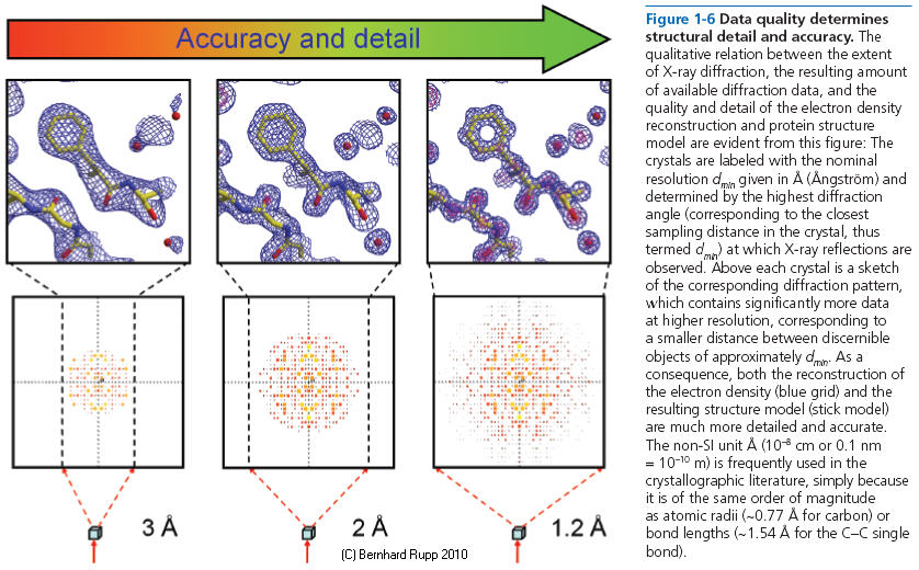 The following figure shows what a certain resolution, given in �ngstr�m (�) means for the user of structural models derived from X-ray data. One always has to remember that the cute model you see was built into an experimental electron density. The model may look as good at 3 � as it does at 1.2 �, but is it a correct and unique description of reality ?
