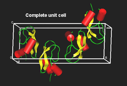 BPTI in space group P 212121This is a real life example for the cell packing in the most common space group for proteins, #19. The model is from our entry 1bpi.pdb, a high resolution structure of Bovine Pancreatic Trypsin Inhibitor. The protein has been used a lot in folding studies.