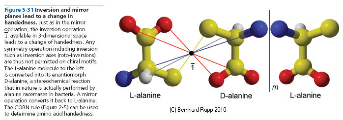 Glide Planes : For the same reasons mentioned above, glide planes, a combination of a mirror plane and a translation operation parallel to it, cannot appear in protein structures and are sometimes ignored in macromolecular crystallography textbooks.They are very common in inorganic structures (diamond for example, has, you guessed it, a diamond glide d). Generally, a glide is constructed by a mirror operation followed by a translation along a/2, b/2, c/2 (a,b,c), a face diagonal (a+b)/2, (a+c)/2, (b+c)/2 (in all cases denoted n) or, in case of d along (a+b)/4, (a+c)/4 or (b+c)/4.