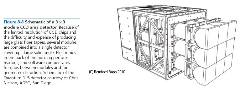 The core of the ADSC CCD detectors is a 1x1 inch semiconductor chip module with 1150x1150 pixels resolution. Four or nine modules are combined to form a 2x2 or 3x3 array. An imaging phosphor faceplate emits photons when hit by X-rays. The photons are collected through an optical taper and detected on the CCD array. Readout times are extremely fast, and due to the high resolution the detector can be moved close to the crystal, which enables very simple data collection strategies comparable to image plates. The big advantage compared to IPs is the absence of any mechanical parts in the detector box. Most common on synchrotrons are 9-module Quantum detectors made by from ADSC.