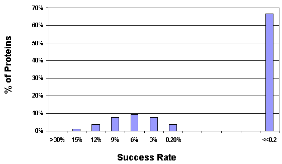 The graph allows an important conclusion: The success rate of crystallization appears bimodal. There is a majority of proteins, ~65%, that crystallized rarely (or not at all), but of those which were crystallized successfully, the success rates are rather high. We recognize that the statistical basis for this conclusion is still weak, but with upcoming data from the TB structural genomics consortium we expect to increase statistical significance.