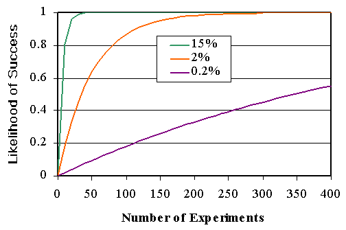 The practical implication of the relatively high success rate for ‘well behaved’ or ‘crystallizable’ is that it is more efficient to stop screening and revert to protein engineering once a certain number of trials have failed to yield a success. Again, using data from known and newly crystallized proteins, we have estimated, based on the cumulative probability distribution, a reasonable number of experiments to be about 300. As a reminder, this is to achieve best throughput with a large number of proteins – your commitment to an individual protein may lure you into screening on and on. Just make sure you realize that at this point you do have a problem and may have to do smarter things that brute force screening. What these smarter things might be is now an individual problem of a specific protein (preparation) – and not a matter of screening statistics.