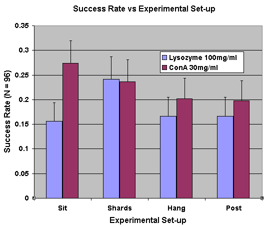 Anecdotal rumors exist that give preference to one or the other setup technique, for example, sitting vs. hanging drop. Again, no statistical validity is attached to these rumors. We therefore did a brief experiment testing ConA and Lysozyme in four different setups. We recognize that both fall into the category of ‘easy-to-crystallize’ proteins, and will follow up with other proteins.