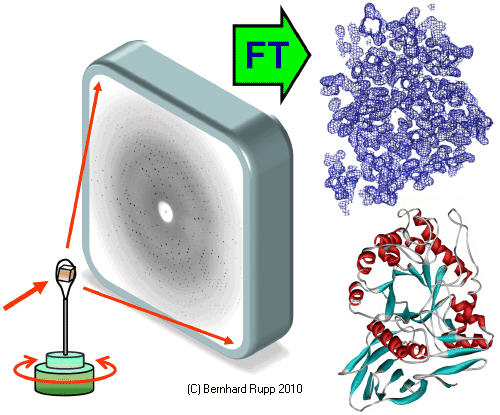 In a macromolecular X-ray diffraction experiment a small protein crystal is placed into an intense X-ray beam and the diffracted X-rays are collected with an area detector (it is advantageous to cool the crystals to low temperatures, primarily to prevent radiation damage). The diffraction pattern consists of reflections of different intensity, and a lot of patterns need to be collected to cover all necessary crystal orientations. After some data processing, we end up with a list of indexed reflections and their intensities. The reflections provide only a part of the information needed to reconstruct the molecular structure, they must be combined with phases to obtain the electron density (blue grid) by means of Fourier Transform (FT) reconstruction or synthesis. In this electron density, the crystallographer or an automated program builds an initial atomic model of the molecular structure. This model is refined and rebuilt until diffraction data calculated from it fit the experimetal data well, and the model itself has good stereochemistry.